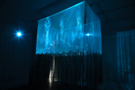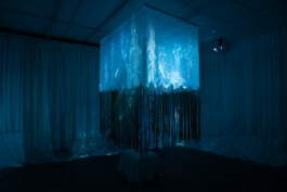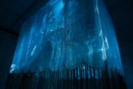 Textile and digital installation (net curtains, cotton thread, wood, metal, video, and soundscape)